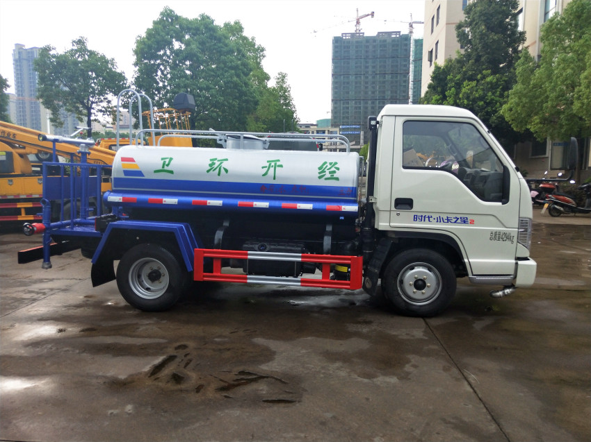 改裝配置:罐體用4MM碳鋼板制作,罐內隔板具有防波作用,以減低汽車行駛時罐體液體的沖擊。整車帶一個專用灑水泵(垂直最大吸程6米),灑水寬度14米,射程28米。多功能灑水車配備2個前沖(噴)(能將路面泥巴、塵土、垃圾沖干凈);2個后灑(能均勻地將水灑在路面,一次灑水寬度14米)、2個側噴(花灑)(能均勻地將路旁綠化帶澆灌)、帶1個后工作平臺,平臺上安裝1個綠化灑水高炮(灑水炮可全方位旋轉,可連續調成直沖狀、大雨、小雨、毛毛雨,霧狀可調節沖洗高大樹木),引水時間<5min,流量90m3/h。帶1個消防接頭,帶1個自流閥,1個過濾裝置、人性化爬梯及側防護欄,安裝灑水音樂喇叭。