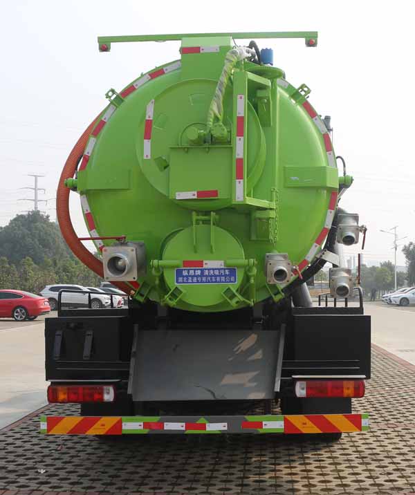 吸污車該車主要用于下水道系統的清理和疏通工作;主要裝置為罐體及清洗吸污裝置總成;罐體尺寸為(總長×直徑)(mm):5650×2000(前部含封頭長2550mm為清水罐,后部含封頭長3100mm為污水罐);污水罐總容量:7.9立方米;有效容積:7.52立方米;介質:液態污物,清水罐總容量:6.32立方米,有效容積:6.02立方米,介質:水;兩罐獨立,且不能同時滿載,清洗功能時用清水罐,吸污功能時用污水罐,兩罐不能同時使用.側、后防護材料均為:Q235碳鋼,連接方式均為:螺栓連接,后部防護截面尺寸(mm):120×60,后部防護離地高度(mm):470;卸料方式為舉升后卸式,ABS系統型號:ABS-VI.E;生產企業:廣州瑞立科密汽車電子股份有限公司.ABS系統型號:ABS-E;生產企業:威伯科汽車控制系統(中國)有限公司,ABS系統型號:3550D-1010;生產企業:東科克諾爾商用車制動系統(十堰)有限公司.采用4800mm軸距.選裝左側樣式;隨底盤選裝限速裝置,限速90km/h.選裝尿素罐位置,選裝電瓶位置。選裝罐體頂部無護欄裝置,選裝側面無罐體加強筋樣式,選裝后部吸污口樣式。
