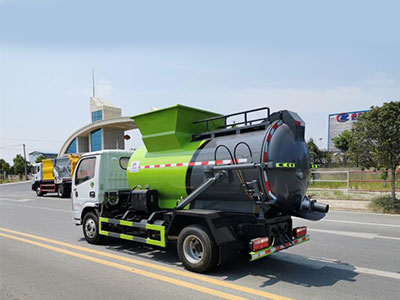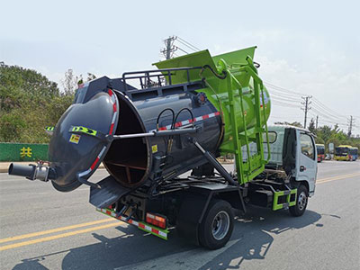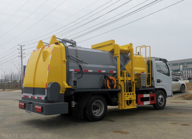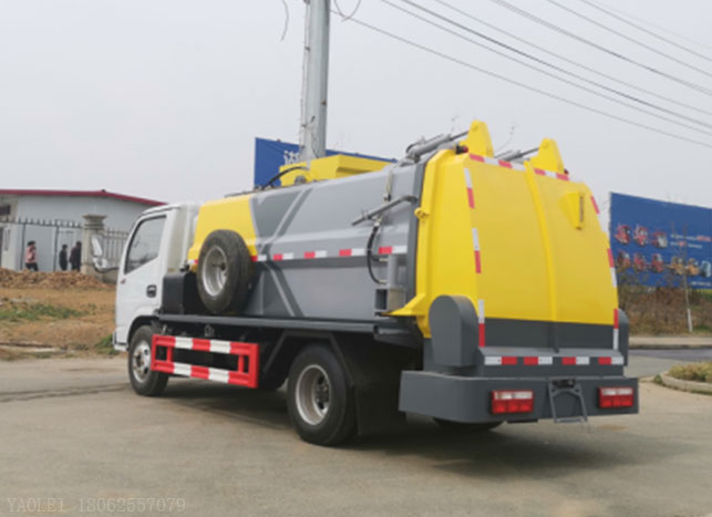 東風小多利卡餐廚垃圾車改裝容積4~5m3,罐體厚度4.75mm,配備掛桶提升機構(gòu),后蓋液壓開啟,罐體可以舉升自卸,尾部帶自流閥。