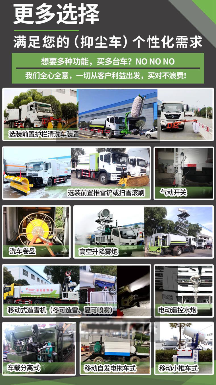 我廠生產的新型多功能抑塵車,集灑水、除塵、治霾、噴藥功能于一身,采用環保除塵風送式噴霧機,能噴射出的水霧達40-100米遠的“霧炮”,可將飄浮在空氣中的污染顆粒物迅速逼降地面,達到凈化空氣的效果,并被人們稱贊為“治霾神器”。
