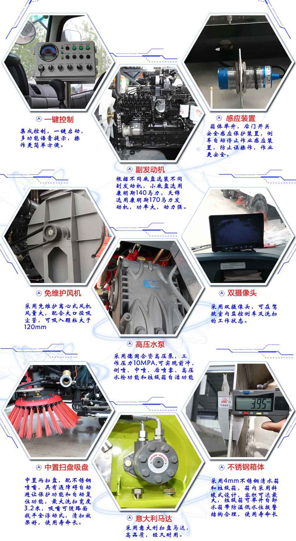 東風(fēng)D9洗掃車上裝配置:帶不銹鋼箱體,容積為9立方,帶2個(gè)中置掃盤,康明斯170馬力副發(fā)動(dòng)機(jī);意大利馬達(dá);德國高壓水泵(前沖/側(cè)噴/中噴/后噴霧/沖洗水槍/垃圾箱自潔裝置);萬向高壓路沿清洗噴頭,威龍低壓泵(前沖);不銹鋼垃圾箱;不銹鋼管高壓管路;德國控制器;韓國控制箱;PLC一鍵控制;尾部LED箭頭燈;機(jī)油、垃圾箱、水箱均帶防溢低水位報(bào)警裝置;倒車及洗掃狀態(tài)室內(nèi)監(jiān)視器。18m高壓沖洗卷盤。清掃寬度3.5m;清洗壓力10MPa;吸入粒度φ110mm。