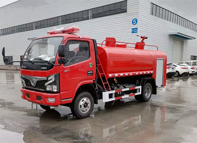 東風多利卡消防灑水車:罐體容積 6.8 立方,達到國五排放標準,配備消防泵和消防炮,射程可達 50 米以上