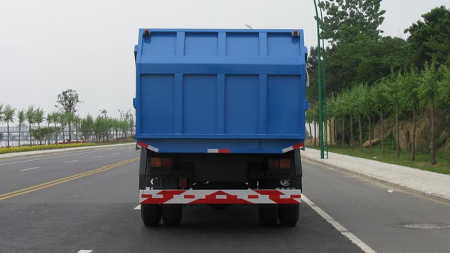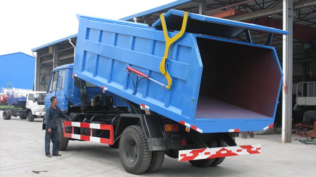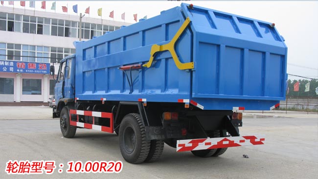 選用4.7米軸距,箱體容積可達15立方米,選用5.1米軸距時,箱體容積可達15立方米。箱體方形,碳鋼材質,邊四底四,頂部密封,箱體后門為液壓開啟,底部雙杠舉升卸料,標配國產油泵,多路閥,取力器,液壓油缸,油泵。
