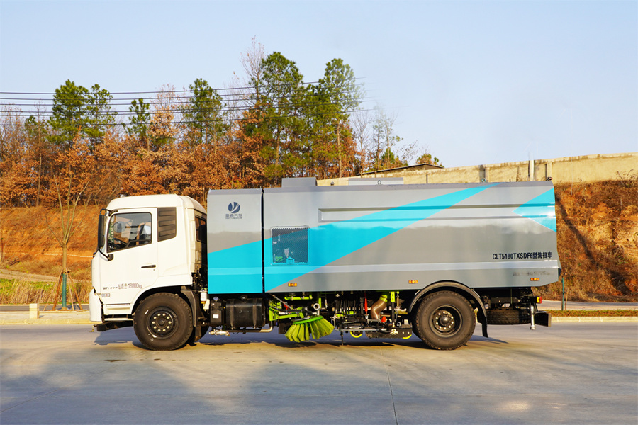 部分車型采用中置四掃刷、吸口后置的布置方式,使得整車結構布置簡捷,清掃效果良好。例如程力掃路車就采用這種布局方式,其垃圾箱及水箱全部采用超厚不銹鋼材料制作,垃圾箱與水箱為整體結構,水箱在垃圾箱的底層使垃圾箱底板預傾角高達12°以上,便于垃圾傾倒干凈。