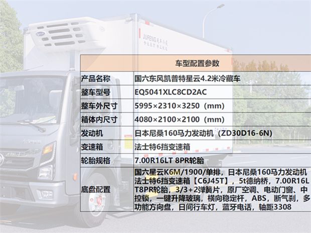 東風星云4米2冷藏車車身配置為:東風K6M1900寬單排駕駛室,東風輕型發(fā)動機,型號為:ZD30D16-6N,法士特6檔變速箱,型號為:C6J45T,5噸后橋德納橋,190mm車架,7.00R16LT 8PR輪胎,3/3+2彈簧片,原裝空調(diào),電動窗,中控鎖,一鍵升降玻璃,橫向穩(wěn)定桿,ABS,斷氣剎,多功能方向盤,日間行車燈,藍牙電話。
