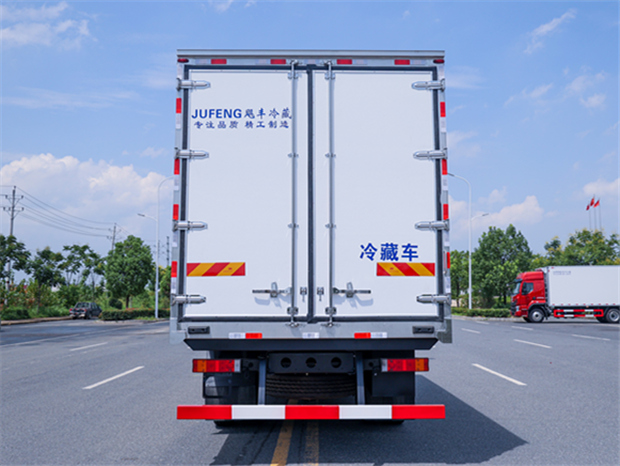 東風天錦6米8冷藏車廂體配置為:斷橋隔溫工藝,整體結構框架,內外面料為3mm新款啞光玻璃鋼夾保溫層真空復合而成,廂體厚度為8cm,最新款鋁合金包邊型材,型材局部厚度為4mm(鋼制鉚釘加固),廂體內部采用2個LED照明燈及廂體示寬燈,后門框不銹鋼材質,門框密封條為三元乙丙橡膠材質,加厚型不銹鋼合頁及鎖件;副梁為Q700車用大梁鋼,15mm厚大梁墊皮,加裝防撞膠塊,不銹鋼門鎖件,配后雙開門,副駕駛一側居中靠前開單側門一個,帶2個排水孔。