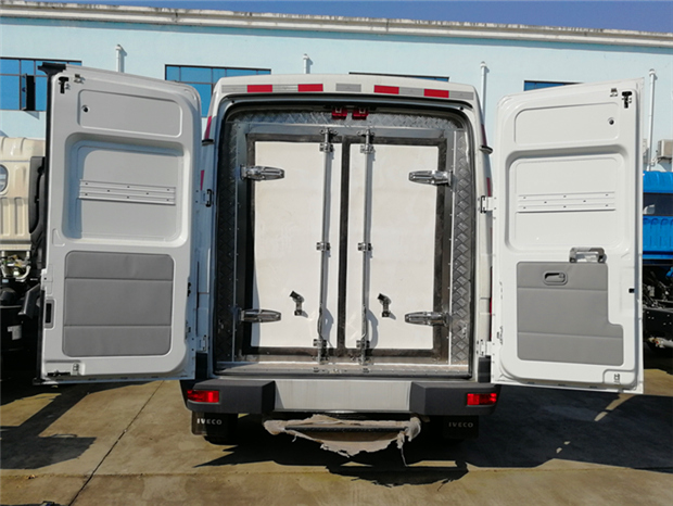 依維柯短軸冷藏車車廂配置:廂體采用內外優質玻璃鋼板,內膽圓弧式廂體,地板為鋁花紋板,底板和四周廂板加裝通風槽,不銹鋼門框,鎖件。
