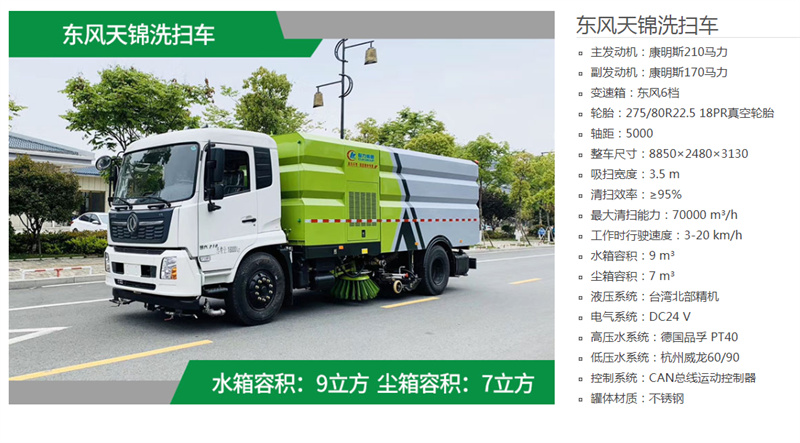 國(guó)六東風(fēng)天錦洗掃車上裝配置:中置2掃盤、吸嘴、三洋馬達(dá)、康明斯170馬力副發(fā)動(dòng)機(jī),德國(guó)原裝進(jìn)口高壓水泵(前沖、側(cè)噴、中噴、后噴霧、側(cè)沖洗車水槍、垃圾箱自潔裝置)、萬向高壓路沿清洗、低壓泵前沖、不銹鋼水箱、垃圾箱;不銹鋼高壓管路、施耐德控制開關(guān)、美國(guó)傳感器、尾部LED箭頭燈、機(jī)油、垃圾箱、水箱均帶防溢或低水位報(bào)警裝置;倒車及洗掃狀態(tài)駕駛室內(nèi)監(jiān)視器、18m高壓沖洗卷盤、最大洗掃寬度3.5m;高壓沖洗高度≥21m。可選裝前置雪鏟、掃雪滾。