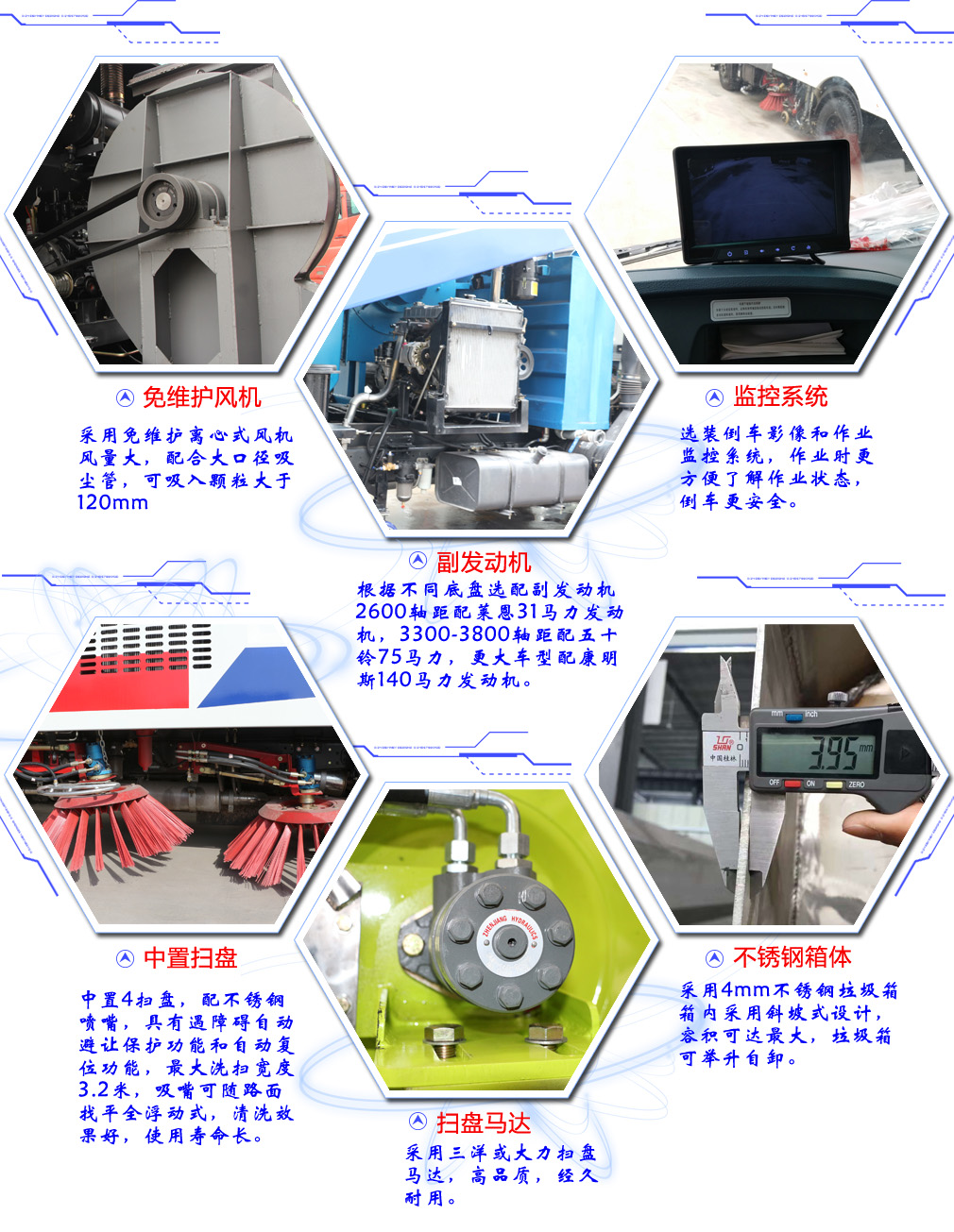 此車為道路洗掃專用車輛,專用裝置為掃刷.防護(hù)裝置均采用Q235A材質(zhì),均采用焊接連接, 專用裝置掃刷代替部分側(cè)面防護(hù),掃刷離地高為(mm):180,后下部防護(hù)與車架焊接連接, 后下部防護(hù)尺寸:50×150(mm),離地面高度420mm. ABS系統(tǒng)型號(hào)為XH-KQ4S4M-E01, 生產(chǎn)企業(yè)為廣州市西合汽車電子裝備有限公司;型號(hào)為CM4XL-4S/4M, 生產(chǎn)企業(yè)為廣州瑞立科密汽車電子股份有限公司.整車長/軸距對(duì)應(yīng)關(guān)系為(mm):7590/4200,7890/4500, 8090/4700,8590/5200,8990/5600,4700/8310,5200/8680.選裝不同的外觀圖片.隨底盤選裝駕駛室. |