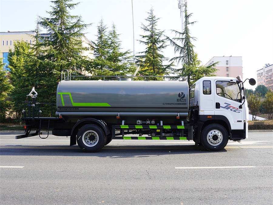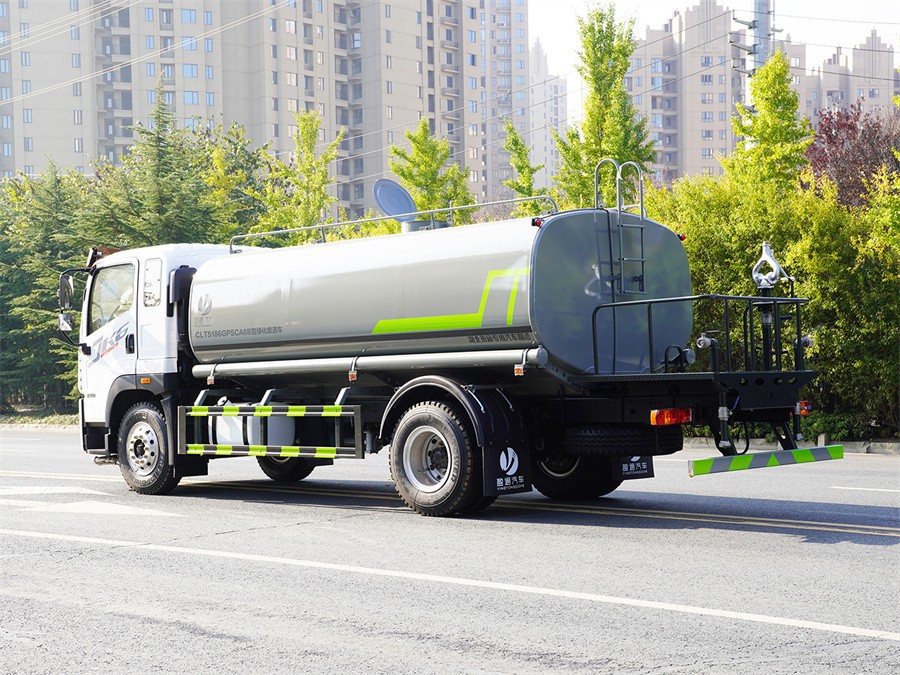產品簡述:縱昂牌 CLT5186GPSCA6B 型綠化噴灑車標配前噴(鴨嘴)、后對沖、 后灑、側噴、后置式工作平臺,平臺上配置綠化水炮(可 360°旋轉,既可以調 成柱狀,也可以調成霧狀),配備優質大功率專用灑水泵(可自吸自排,可從河 里或池塘抽水到罐體),取力器,雜物過濾網,消防接口,自流球閥系統、取力 器、球閥、濾網均為國家標準產品,主管道加粗,法蘭墊、法蘭盤加厚,大通徑 球閥。整體具備性能優良安全可靠、效率高、流量大、維修方便等特點