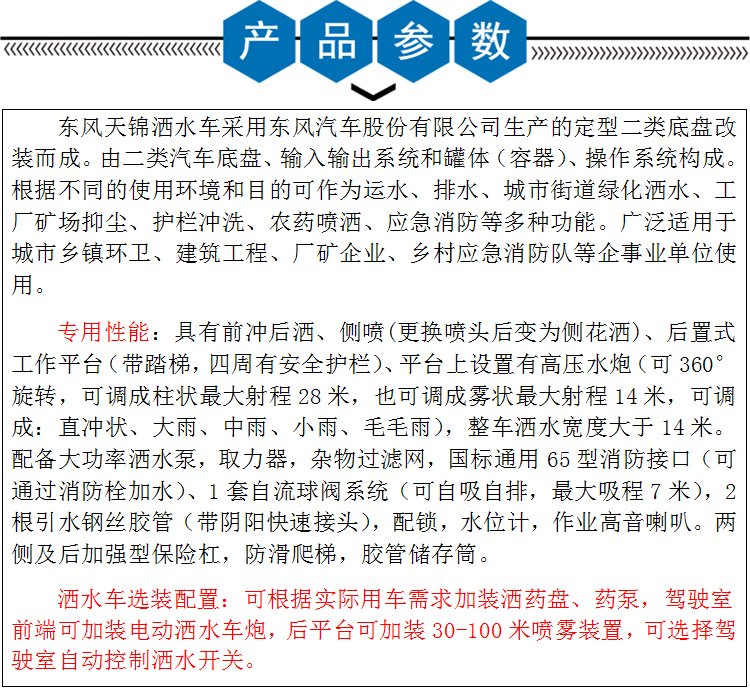 灑水車:又名公路養(yǎng)護(hù)灑水車,綠化噴灑車,是城市保潔,工程養(yǎng)護(hù),道路清洗,綠化工程的必備車型。該系列車型,配備了前沖,后灑,側(cè)噴,后自流閥,后消防栓接口和綠化炮。獨(dú)有設(shè)計(jì)的多功能綠化平臺(tái),可活接1寸口徑的各類軟水管,是各類工程作業(yè)的必備工具車。成立以來(lái),我們企業(yè)設(shè)計(jì)生產(chǎn)的各類灑水車產(chǎn)品,先后參與如三峽葛洲壩建設(shè),南水北調(diào),高鐵建設(shè)等大型建設(shè)項(xiàng)目,并多次輸送世界各地,支援戰(zhàn)后國(guó)家重建