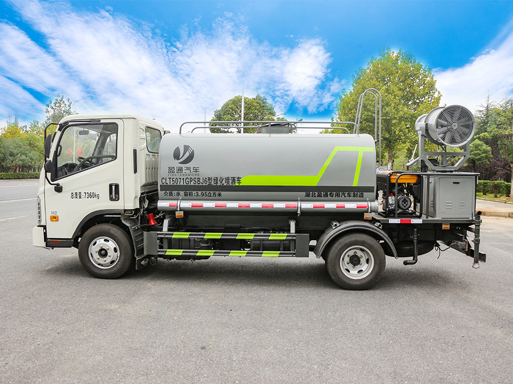 北京藍牌灑水車產品主要技術參數 序號 名稱 型號、規格 1 整車型號 CLT5041TDYBJ6 型多功能抑塵車 2 發動機型號 Q23-115C60 3 發動機馬力/功率 全柴 115 馬力/85KW 4 發動機排量 2300ML 5 變速箱 萬里揚 5 檔 6 輪胎規格 7.00 鋼絲胎 7 軸距 3360 8 總質量 4495KG 9 整備質量 3650KG 10 額定載質量 650KG 11 整車尺寸(長×寬×高) 5.998*1.99*2.6 12 罐體容積 5 方 13 燃料種類 柴油 14 排放標準 國六 15 水泵型號 40/50 16 罐體材質 Q235 碳鋼