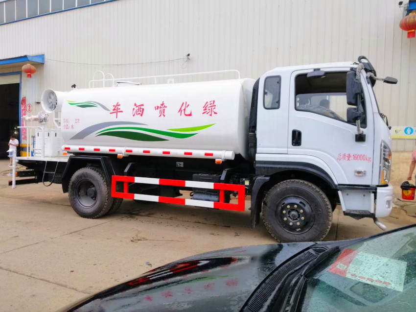 吸程7米,灑水寬度14-16米,射程25-30米,引水時間<5min,流量60m3/h。前沖()、后灑、帶側噴(花灑)、帶后工作平臺、平臺上安裝綠化灑水高炮(炮噴射形狀可調節:直沖、大雨、中雨、毛毛雨、霧狀、可連續調節,360°旋轉),配消防接口,自流閥,濾網,帶自吸自排功能配備大功率專用灑水泵,泵可自吸自排,安裝過濾網,帶消防接口,可通過消防栓進水,帶自流閥,隨車選裝20米綠化卷盤,可噴灑農藥,罐體金屬漆。罐體有橢圓和方圓罐兩種,可根據用戶的要求定做,前橋5噸,后橋10噸,康明斯190匹馬力國五發動機,法士特8檔變速箱,ABS,空調