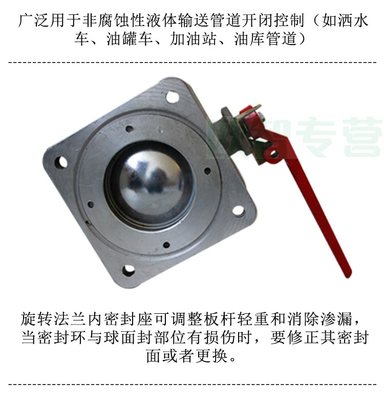 綠化灑水車配件-直通球閥 直通球閥又稱二通球閥,方法蘭,鋁合金產(chǎn)品,防腐防銹。直通球閥用途:廣泛使用在灑水車,油罐車,化工車,消防車等專用汽車上直通球閥型號:DN50,DN65,DN80,DN100。直通球閥特點(diǎn):球閥采用鋁合金殼體,不銹鋼球芯,具有材料配制合理結(jié)構(gòu)緊湊,重量輕,體積小,使用方便等優(yōu)點(diǎn),設(shè)有限位和加鎖裝置,安全可靠。直通球閥調(diào)整:旋轉(zhuǎn)法蘭內(nèi)密封座可調(diào)整板桿輕重和消除滲漏,當(dāng)密封環(huán)與球面封部位有損傷時(shí),要修正其密封面或者更換。